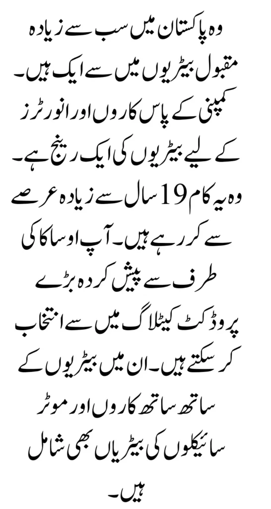 They are one of the most popular batteries in Pakistan. The company has a range of batteries for cars and inverters. They have been doing this for over 19 years now. You can choose from the large product catalog offered by osaka. These include maintenance batteries as well as batteries for cars and motorcycles.